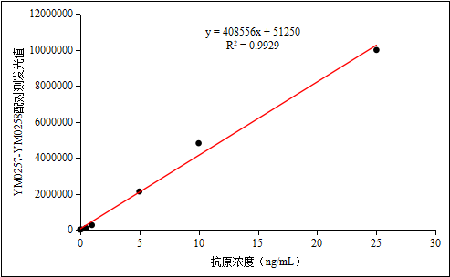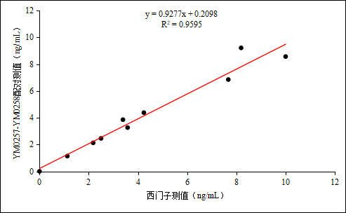 YM0257-YM0258配对抗体与西门子试剂测试临床样本在1-10μg/mL范围内,临床相关性R方为0.9595。