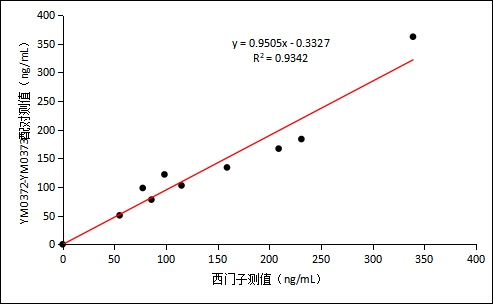 YM0372-YM0373配对抗体与西门子试剂在55-339ng/mL范围内测试临床样本,相关性R方为0.9342。