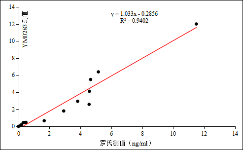 YM0283抗体与抗原搭配做成试剂盒测试临床样本与罗氏试剂相关性R方为0.940。