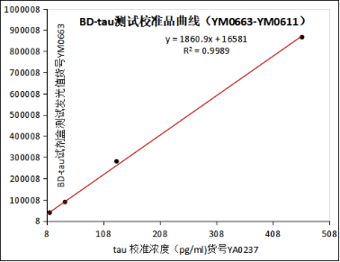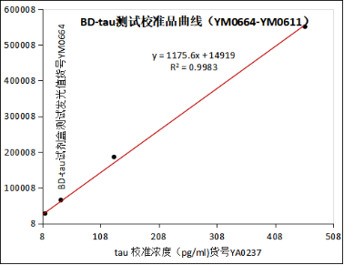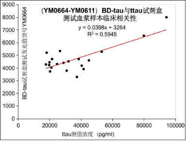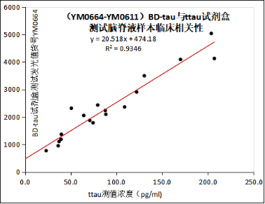 雅为自产BD-TAU配对抗体在磁微粒发光试剂平台中与总tau试剂和同时测试脑脊液中tau含量,两个项目表现出很强的相关性,而在同步测试血浆样本中无明显的相关性,可以说明配对抗体的灵敏度及特异性均能满足项目需求。